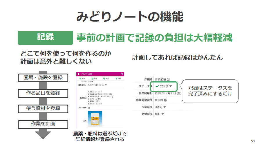 「みどりノート」では、農業生産の計画を立て、それに紐付いた記録を付けることができる。中でも、農薬や肥料の計画は重要なのだという。例えば、収穫直前に使用してはいけない農薬があり、誤って使用すると販売できないケースも存在する。そういった状況を防ぐメリットがある。