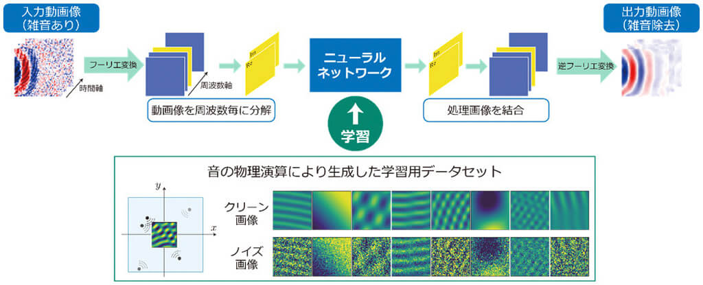 独自のモデルでは、音の物理的な性質に基づいた演算により人工的に生成した訓練画像を用いて、ニューラルネットワークの学習を実施した。さらに、動画像を周波数毎に独立して処理する独自アルゴリズムにより、従来手法を大幅に高精度なノイズ除去処理を実現した。