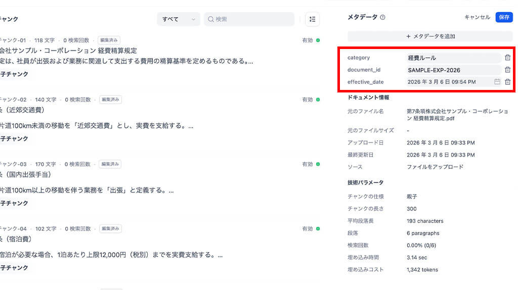 ドキュメント自体にこれらの情報を付与しておくことで、分割された一つひとつのチャンクに対してAIが「これはいつの、何の資料か」を正確に把握した状態になります。