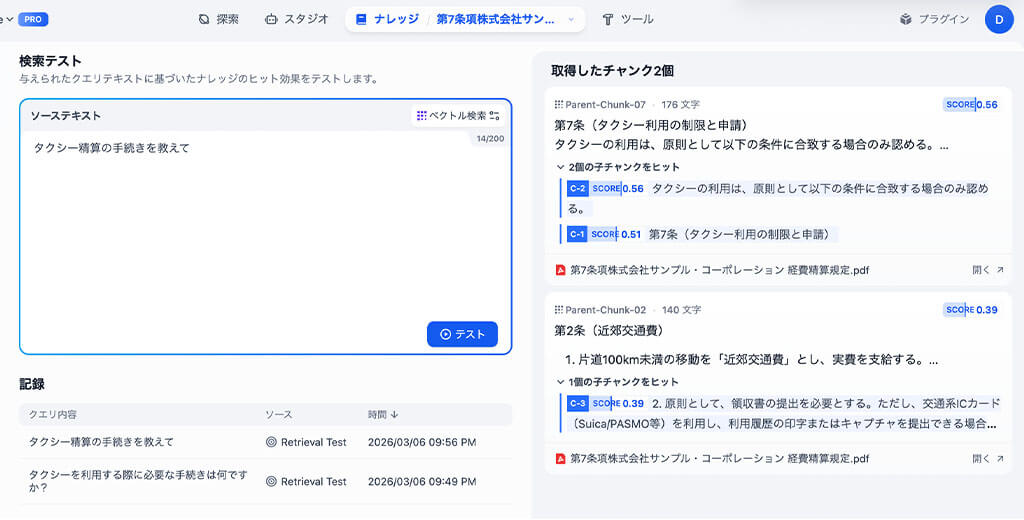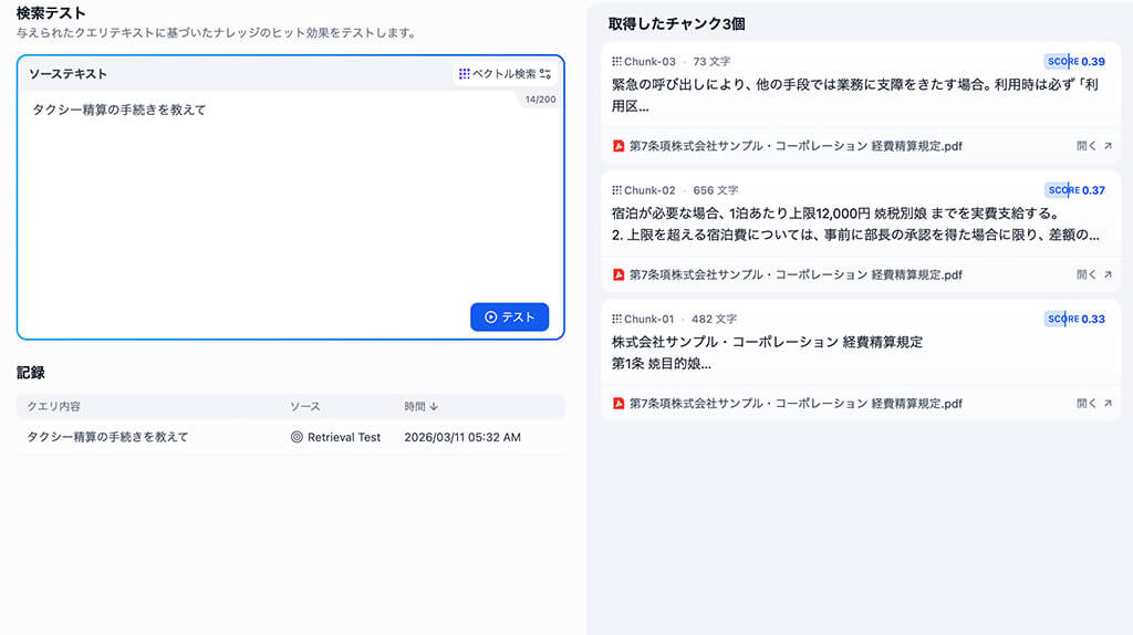 比較するために、全く同じ「経費精算規定」の内容を、汎用モードにて文字数でページを切り分けたチャンク分割の場合でも検索テストをしてみました。