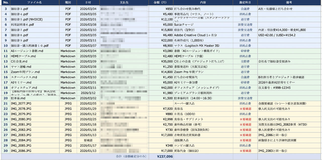 「このフォルダ内にある全ファイルを解析し、日付、支払先、金額、内容、勘定科目を抽出してください。PDF・メモ・写真が混在していますが、全て読み取った上でデスクトップに『経費精算リスト_検証結果.xlsx』として保存してください。勘定科目は内容から適切に分類し、判断が難しいものは『要確認』と明記すること。」