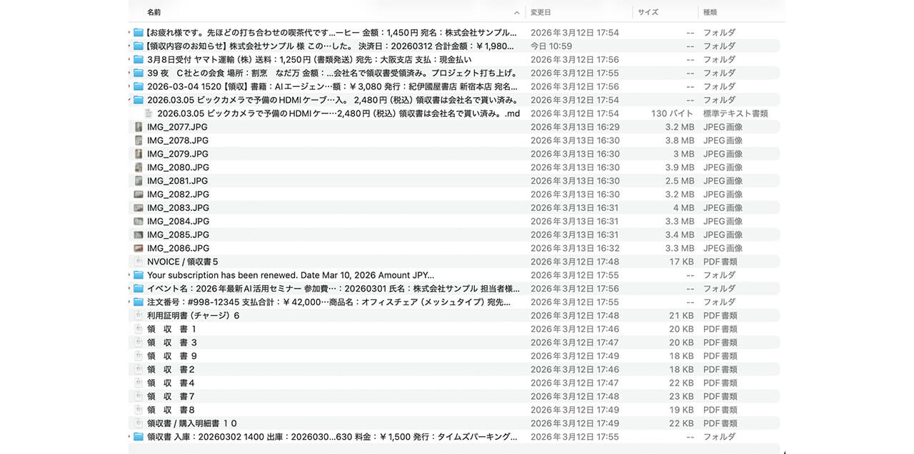 検証手順としては、検証用に作成した「2026_経費精算検証」フォルダに、上記30件のファイルを無秩序に格納。
