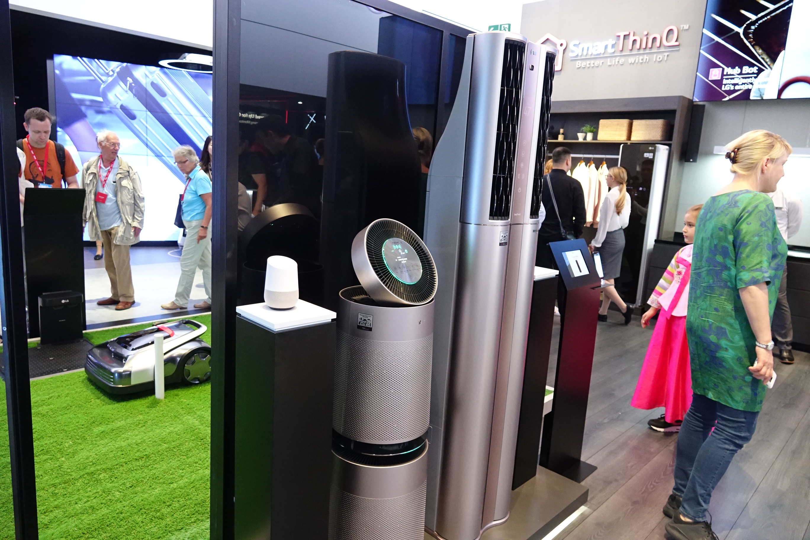 LGのプライベートかつオープンな戦略を感じさせるのが、テレビの横に置いてあるのは、Amazon Echoで、ファンの横に置いてあるのは、Google Homeというところだ。