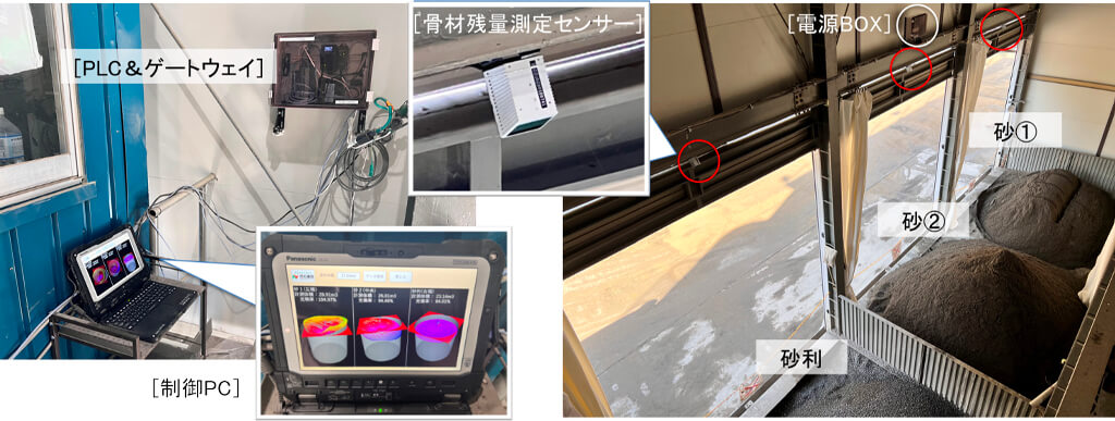 骨材残量の計測には、LiDARが使用されており、LiDARで取得した骨材ビンの残量の形状から体積を算出している。なお、計測は24時間、365日リアルタイムに稼働しており、計測誤差3%以内で残量を数値化することで、確実な材料管理が可能となっている。
