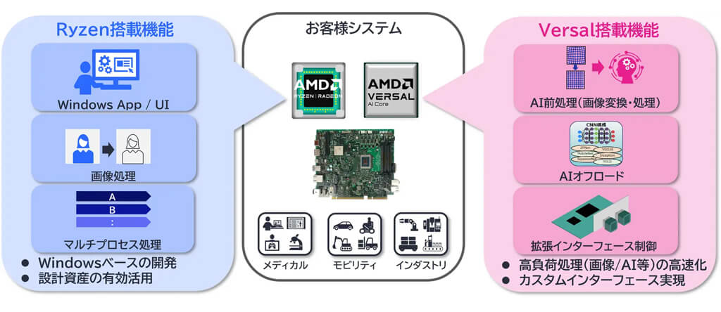 今回発表されたマザーボードは、両製品の特性を活かすことで、カスタムインターフェースへの対応や、プログラマブルロジックとVersal AIエンジンによるアクセラレーション活用、低消費電力かつ低レイテンシでの画像処理やエッジAI推論を可能にする。