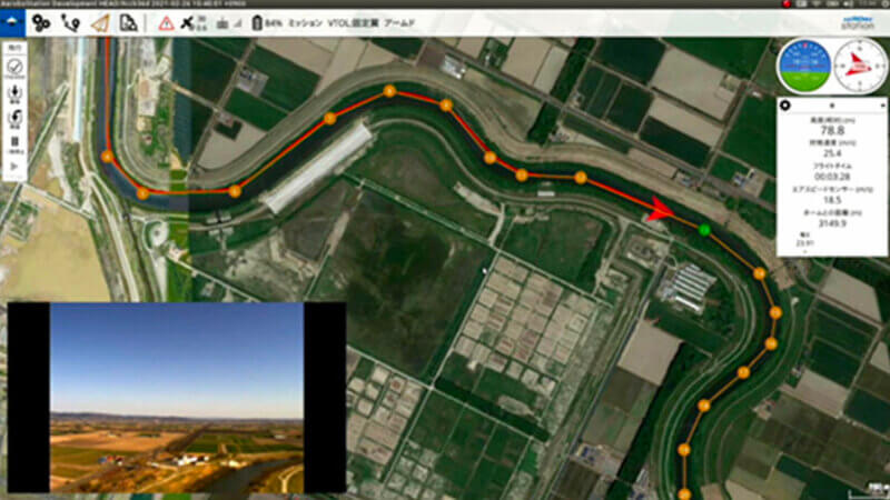 実証実験で飛行したルート(一部)およびLTE通信による映像伝送画面。