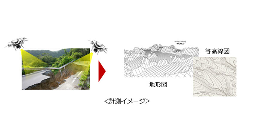 土砂崩れの緊急対応時などにドローン空撮および画像解析ソフトを使用することで安全かつ迅速に土砂量を計測可能。