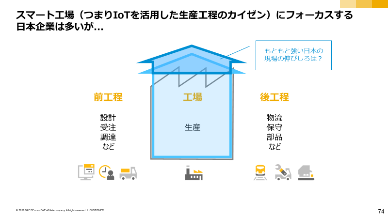 -既存のサプライチェーンマネジメントのモジュールに、IoTやAIが入ってきた、というわけですね。例えば産業向けIoTで、スマートファクトリーをつくるとすると、ショップフロア(生産現場)とつないで、生産そのものをインテリジェントにするところはきっとモード2の部分ですよね。一方でその工場に対して、受注がいくつ入ったから何を何個生産しろと指示を出すとか、それをつくるためにサプライヤに何を何個発注するみたいな話は、あくまでもSAP S/4HANAの世界でありモード1に入る、ということでしょうか。