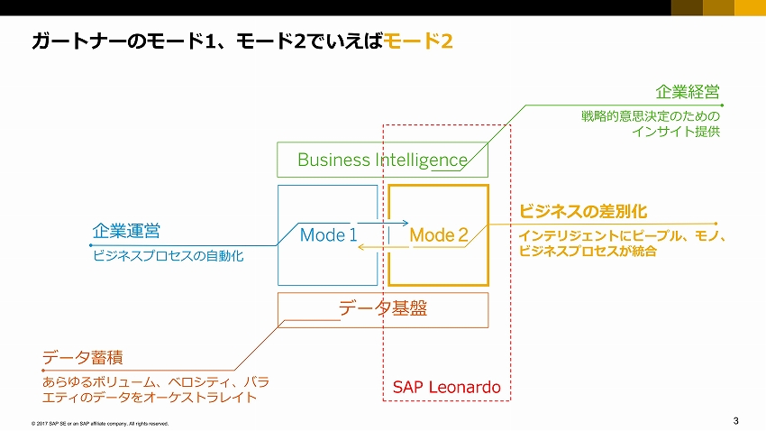 それに対し、「ビジネスの成長と革新の要件に応え、変化対応型のアプローチを取る」モード2がSAP Leonardoです。これは、デジタルに支えられた新規ビジネスを「早く、確実に」構築するための部品群および方法論です。SAP製品のほぼ半分なので、それなりにインパクトの大きい話です。