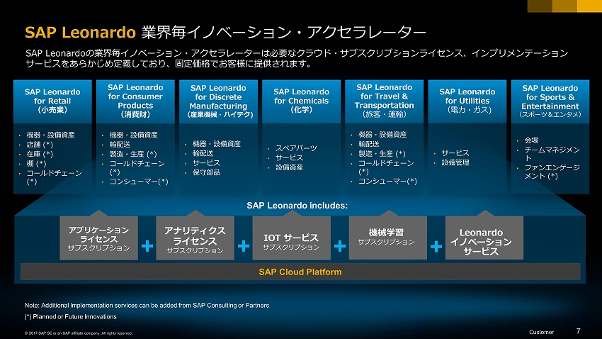 2017年5月にSAP Leonardo(レオナルド)を発表しました。これは、IoTやMachine Learning、アナリティクス、ビッグデータ、ブロックチェーン、デザインシンキングなどを含む包括ブランドです。ものすごくざっくり表現すると、SAPが扱っている製品の半分、「ERP系以外」がLeonardoです。