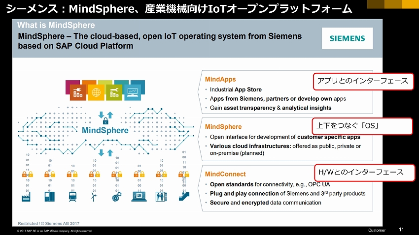 次は、シーメンスの産業用IoTプラットフォーム、MindSphere(マインドスフィア)の事例です。下記図をご覧ください。MindSphereのレイヤーが真ん中にあって、上がアプリ、下がハードウェアです。このMindSphereは、SAP Cloud Platformベースで作られています。