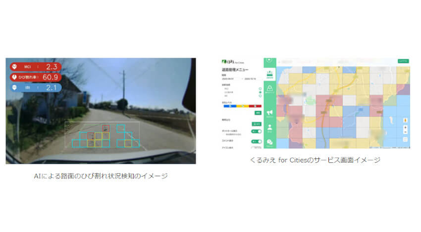 同サービスはクラウド型のサービスで、自治体が保有するパトロール車両等にドライブレコーダーを取り付けて走行するだけで、路面のひび割れ状況や平坦性などを広範囲かつ効率的に調査することができる。専用車両や高価なカメラ機器などの初期投資が不要なため、顧客は手軽に道路劣化診断を開始し、予防保全を含むデジタルメンテナンスの実現につなげることができる。