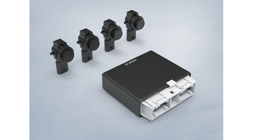 ボッシュのサイドビューアシストに使用されている4つの超音波センサーは、車両の前方と後方に左右一対で組み込まれている。