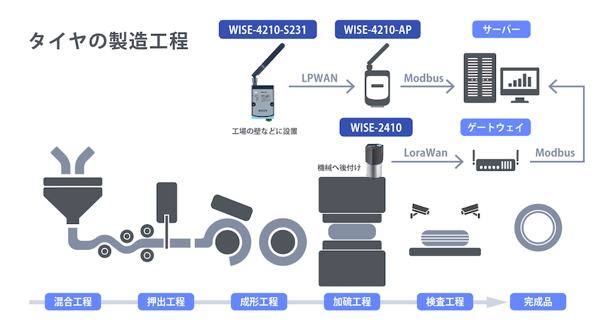 アドバンテック製品を使用したタイヤ工場の管理方法。データを無線で飛ばすことができるため配線工事の必要がない。