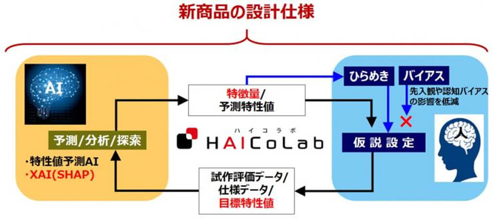 技術者は、「XAI」で得られた情報(求めるタイヤ特性に役立つ特徴量)を多角的な視点で解釈して仕様を修正し、横浜ゴムが2021年に開発した特性値予測AIを使って各特性値が目標を達成しているかを確認することができる。