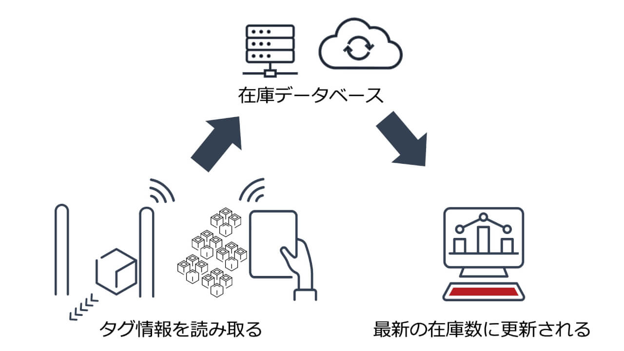 在庫管理システムと連携することで、ハンディリーダーなどで読み取ったタグ情報がシステム内の在庫データベースに送信され、実際の在庫数に基づいて情報が更新されるため、棚卸し作業を効率化することができます。
