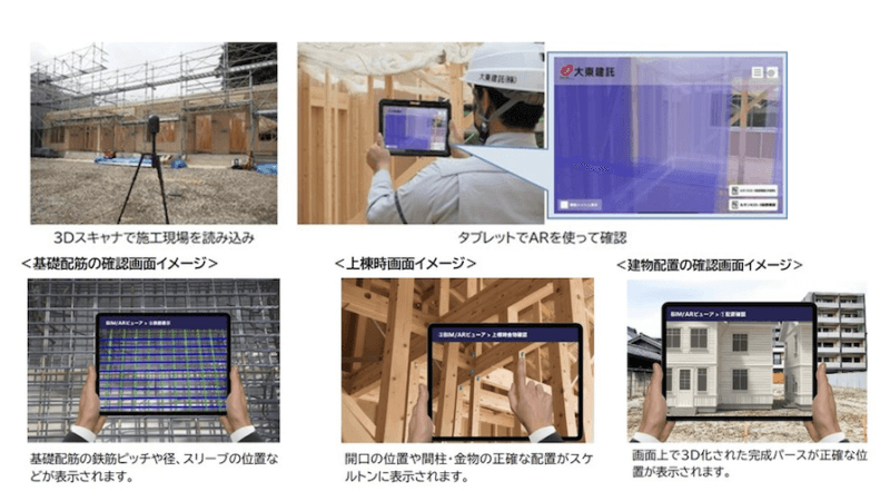 同システムは、現場従事者がタブレットやスマートフォンを通して建物や躯体の完成イメージをARで確認することができるため、従来、設計図面を見ながら照合していた確認・検査業務を効率的に行うことができる。また、ヒューマンエラーがなくなるため、品質管理の精度向上にも期待できる。