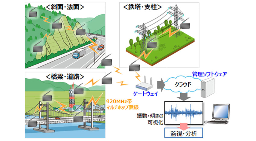 「無線加速度センサーユニット」は、電波到達性に優れた920MHz帯無線と、無線マルチホップ機能に対応することにより、自動的に最適な経路で接続され、柔軟に無線ネットワークを構築する。